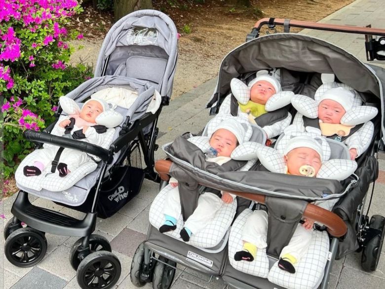 현역 육군 장교 부부인 서혜정 소령과 김진수 대위는 지난 2021년 인공수정으로 다섯 쌍둥이를 출산했다. 당시 서욱 국방부 장관이 4인용·2인용 유모차를 하나씩 선물해 이듬해 아이들이 타고 있는 모습(사진). 지난 20일 서울성모병원에서는 교육 공무원과 교사인 사공혜란·김준영씨 부부가 국내 처음으로 자연 임신을 통해 다섯 쌍둥이를 출산했다. 서 소령은 사공씨에게 연락해 축하하고 다섯 쌍둥이가 쓰던 유모차를 선물하기로 했다. /서혜정·김진수씨 제공 |