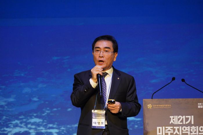 태영호 민주평화통일자문회의 사무처장이 지난 10일 서울 광진구 그랜드 워커힐 호텔에서 열린 제21기 해외지역회의 개회식에서 업무보고하고 있다. [사진 출처 = 민주평화통일자문회의, 연합뉴스]
