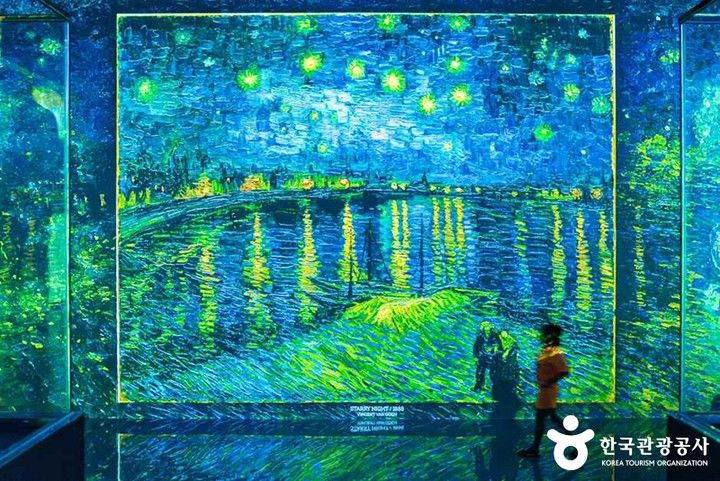 이곳의 하이라이트는 전시관 마지막에 있다. 바로 프랑스 오르세미술관과 협업한 <오르세 특별전>이다. 에두아르 마네의 '피리 부는 소년', 빈센트 반 고흐의 '별이 빛나는 밤' 등 오르세미술관의 주요 작품을 아르떼뮤지엄만의 방식으로 재해석했다. 마치 그림이 살아 움직이는 듯한 생생한 영상을 약 30분 동안 음악을 들으며 즐길 수 있다. 전시장이 넓어서 관람객이 많아도 혼잡하지 않으니, 자리를 잡고 앉아 천천히 작품을 감상해보자.