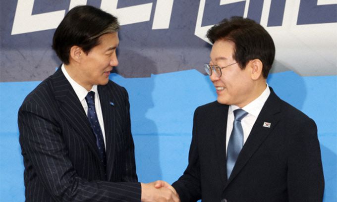 조국(왼쪽) 조국혁신당 대표와 이재명(오른쪽) 더불어민주당 대표가 국회에서 악수를 하고 있다. 뉴시스