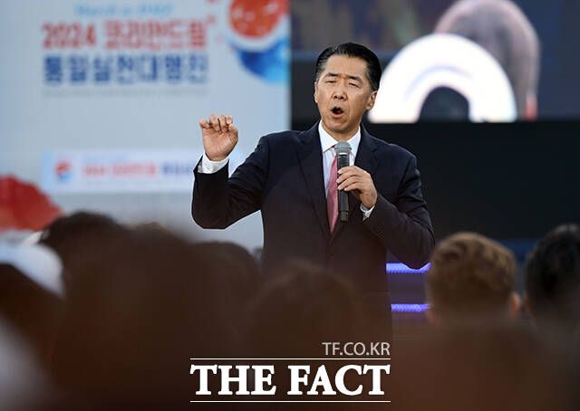 [더팩트ㅣ사진공동취재단] 문현진 GPF재단 이사장이 28일 경기도 파주시 임진각 평화누리공원에서 열린 2024 코리안드림 통일실천대행진에서 기조연설을 하고 있다.