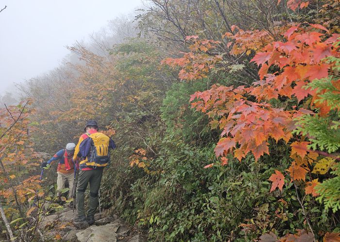 29일 강원 속초시 설악산국립공원 중청∼소청 탐방로의 나무들에 단풍이 물들고 있다. 연합뉴스 |