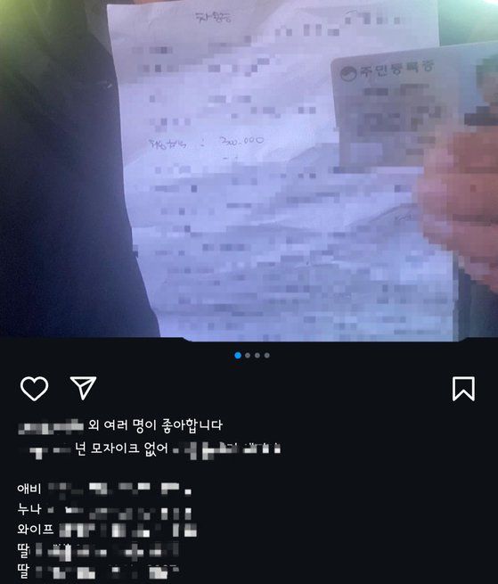 인스타그램에 불법 추심 관련 키워드를 검색해보니 불법 대부업체가 운영하는 한 계정에서 채무자로 추정되는 한 인물이 차용증을 들고 있는 얼굴 사진과 그의 가족들 이름과 연락처가 적힌 게시글이 올라와 있었다. 독자 제공