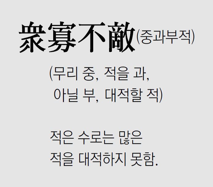 ● 생각거리: 옛날 전투에선 사람과 사람이 맞붙어 싸웠기 때문에 군사의 수가 매우 중요했습니다. ‘중과부적’이란 무리가 적으면 대적할 수 없다는 뜻으로, 도저히 어찌해 볼 수 없는 전투 상황을 가리킬 때 쓰는 표현입니다.