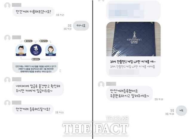1일 <더팩트> 취재를 종합하면 A(46) 씨는 지난 18일 오후 9시19분께 아이돌그룹 '2PM'의 한정판 LP를 12만원에 판매한다는 한 네이버 중고거래 카페 게시글을 본 뒤 채팅방을 통해 작성자 B 씨에게 거래를 원한다는 메시지를 보냈다. B 씨는 "안전거래를 하자"며 별도의 링크를 보냈다. 링크를 접속하자 네이버페이 안전결제 사이트로 연결됐고, A 씨는 별다른 의심 없이 B 씨에게 12만원을 보냈다.