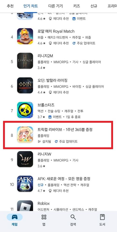 한편, 현재 구글플레이는 국내 MMORPG 대작 일부를 제외하면 외산 게임이 점령하고 있는데, 트릭컬 리바이브는 국산 서브컬처 게임임에도 불구 최상위권을 기록해 업계의 이목을 집중시키고 있다.