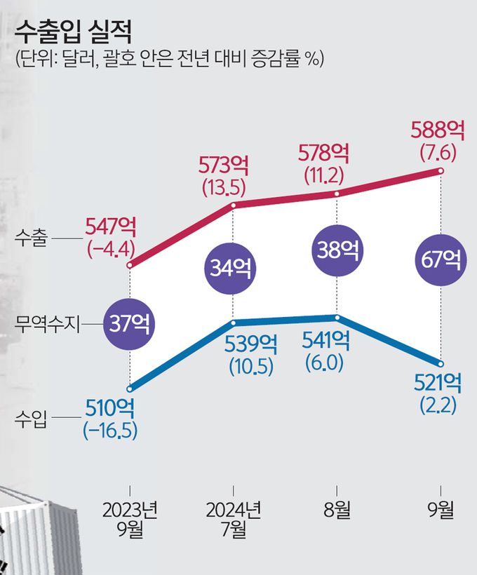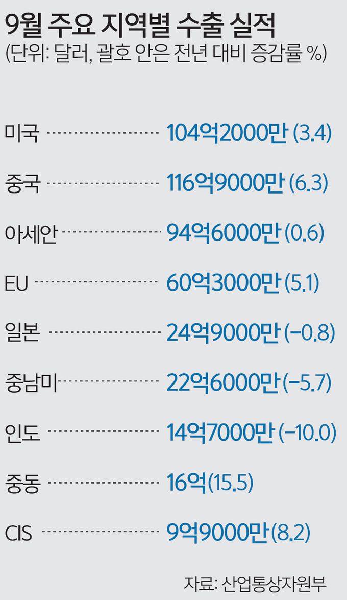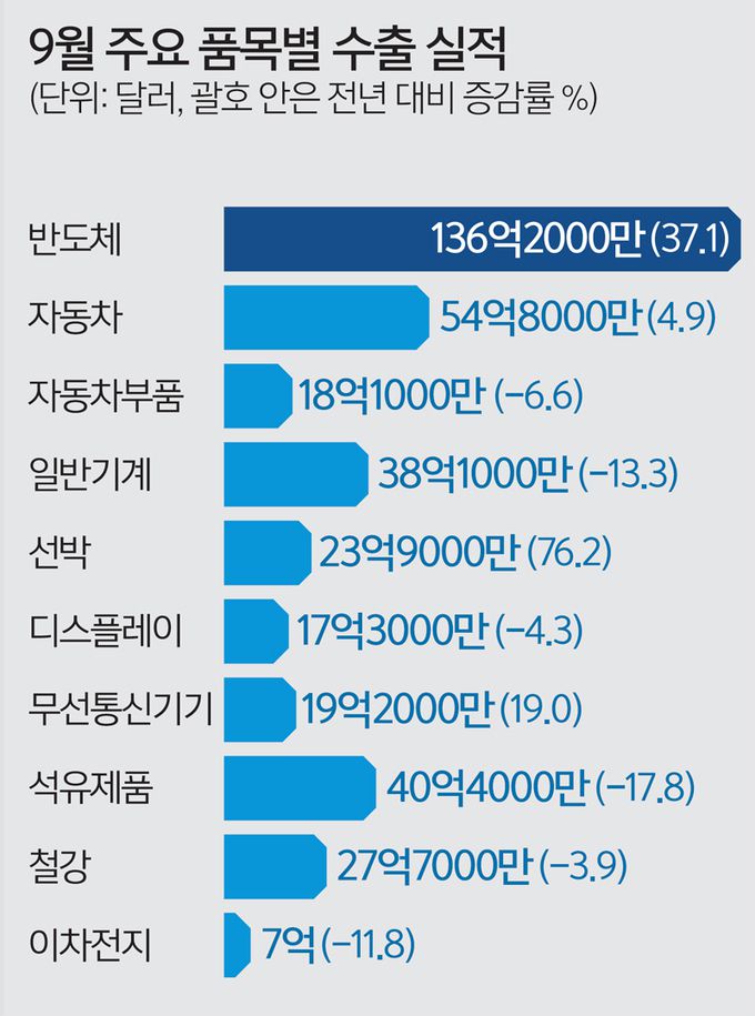 반면 디스플레이(-4.3%), 자동차부품(-6.6%), 일반기계(-13.3%), 석유제품(-17.8%), 석유화학(-0.6%), 가전(-13.9%), 섬유(-2.8%), 철강(-3.9%), 이차전지(-11.8%) 등은 전년 9월보다 감소했다.