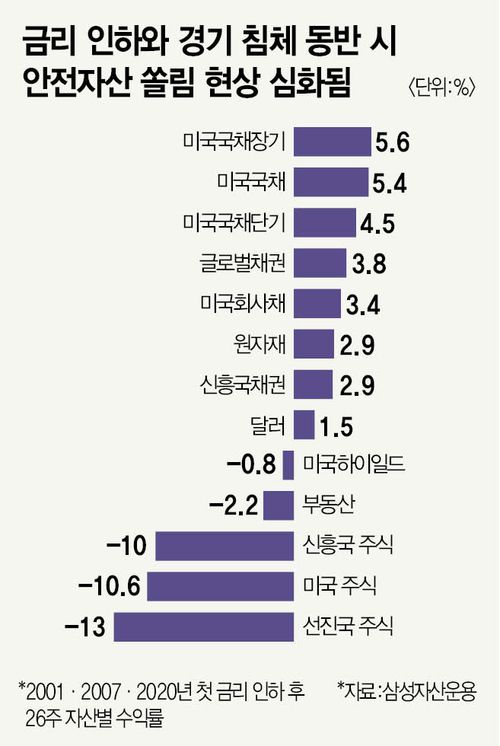 이 같은 시장 반응은 과거 사례를 보면 이해할 수 있다. 그동안 경기 침체를 동반한 금리 인하는 안전자산으로 쏠림 현상을 심화했다. 삼성자산운용 리서치센터가 1990년 이후 5차례(1990·1995·2001·2007·2019년) 있었던 미국 금리 인하 시기 자산별 수익률(첫 금리 인하 후 26주)을 분석한 결과다. 해당 분석에 따르면 경기 침체로 인해 금리를 내린 시기에는 안전자산으로 꼽히는 미국 장·단기채나 달러 등이 ‘플러스(+)’ 수익률을 기록했다. 반면, 위험자산인 선진국·신흥국 주식은 ‘마이너스(-)’ 수익률을 기록했다. 빅컷으로 금리 인하를 시작한 2001·2007년의 경우 이후 2~3개월 뒤 침체 국면에 진입했다.