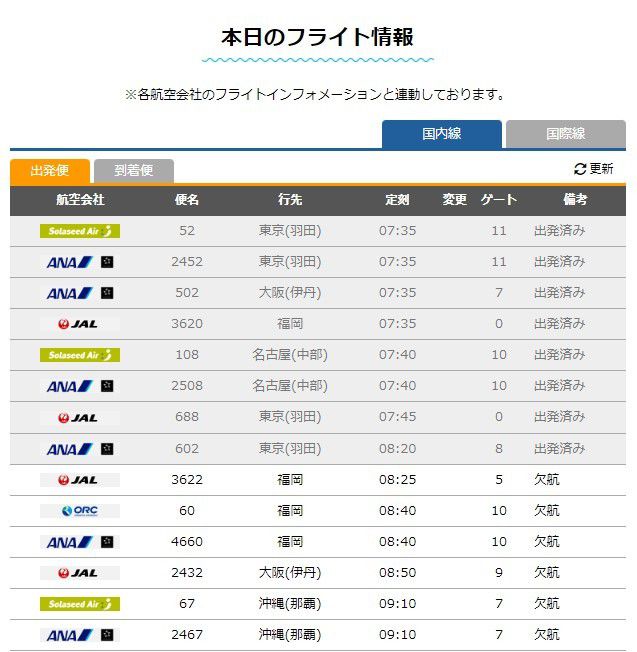 2일 일본 미야자키 공항 운항 정보 일람. 유도로에서 불발탄이 폭발해 오전 8시 25분 출발하는 여객기부터는 줄줄이 결항된 것을 확인할 수 있다. 2024.10.02/ |