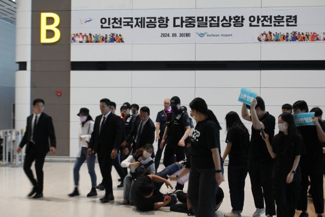 인천국제공항공사가 유명 연예인 출국으로 대규모 인파가 공항에 운집한 상황을 가정해 안전훈련을 진행했다.