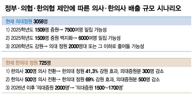 공교롭게도 같은 날(9월30일) 한의사들도 사실상 '한의사 감원 효과'를 낼 만한 정책을 공개 제안했다. 한의협은 이날 기자회견에서 "한의대에선 의대 교육 커리큘럼의 75%를 배운다"며 "나머지 25%(수술·봉합 등)를 최대 2년간 배우고 국가고시를 치러 합격한 한의사에게 필수의료 분야 의사 면허를 발급해달라"고 의견을 냈다. 내년부터 의사 전환을 희망하는 한의사 300~500명을 대상으로 교육을 실시하면 2026년 이후 의대정원 증가 폭(+2000명)을 그만큼 축소할 수 있다는 것이다.