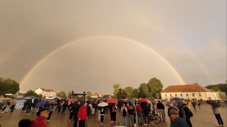 지난달 11일(현지시각) 독일 브란덴부르크주 소도시 오라니엔부르크 광장에서 열린 ‘독일을 위한 대안’(AfD) 유세 현장. 유세장과 그 옆의 ‘극우 반대 집회’ 참가자들을 무지개가 감싸고 있다. 장예지 베를린 특파원 penj@hani.co.kr