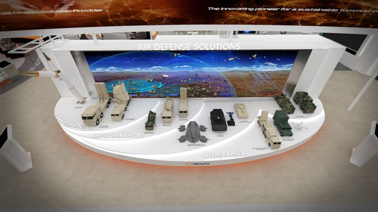 한화 부스 중앙에는 한화시스템이 개발해 미사일 위협을 탐지하는 중장거리용 다기능레이더(MFR), 다표적 동시교전 다기능레이다와 함께 한화에어로스페이스가 개발한 장거리 요격미사일이 첫 전시됐다. '안티 드론존'에는 세계 최초로 전력화된 한화에어로스페이스의 레이저 대공무기 및 적 드론을 방어하기 위해 출격하는 레일형 발사대 등이 공개됐다. 고도 10km 이하 저고도 위협을 방어할 수 있는 무기체계로 드론 공격을 효과적으로 방어할 수 있다.