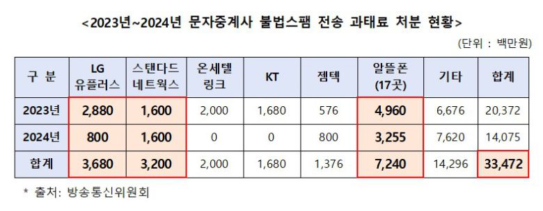 지난 2년간(2023년~2024년) 불법문자 스팸으로 정보통신망법 위반에 따라 과태료를 처분받은 사업자는 총 73개 사업자로 과태료는 총 3억 3472만 원으로 집계됐다. 업체들이 불법 문자 스팸으로 벌어들이는 금액 대비 처벌 수준이 낮다는 지적이 나온다.