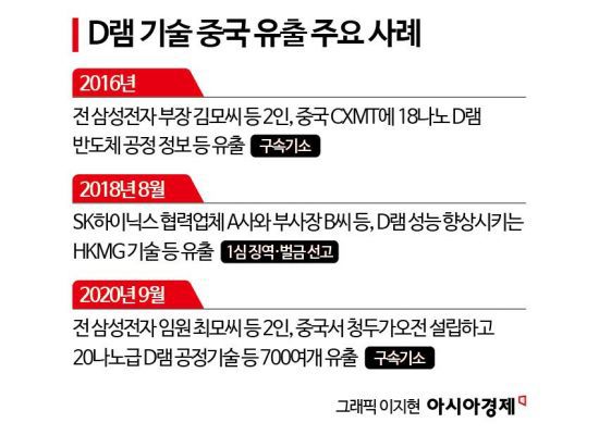 5일 법조계와 업계에 따르면 수사당국이 근년 간 중국으로 유출된 것으로 적발하면서 확인된 우리 반도체 기술은 전부 D램에 집중됐다. 지난달 27일 서울중앙지검 정보기술범죄수사부(부장검사 안동건)가 산업기술보호법, 부정경쟁방지법 위반 혐의로 구속기소한 청두가오전(중국) 대표 최모(66)씨와 개발실장 오모(60)씨가 2020년 9월께 중국에 넘긴 것도 D램 공정기술이었다. 해당 기술은 삼성전자가 4조원을 투입해 개발했다. 유출된 기술을 바탕으로 청두가오전은 중국에서 두 번째로 D램 시범 웨이퍼를 생산하고 20㎚(나노미터·10억분의 1m) 공정을 기반으로 한 D램을 개발한 것으로 조사됐다. 이보다 앞선 2016년과 2018년 중국으로 유출된 기술도 차세대 D램을 만들고 성능을 향상시키는 것들이었다.
