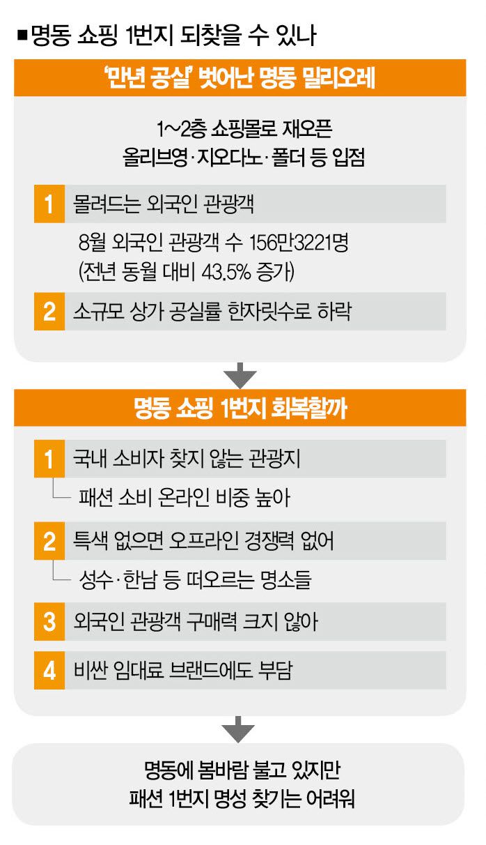 그렇다면 밀리오레의 재개점은 명동의 부활을 의미할까. 명동이 과거처럼 '쇼핑 1번지'의 명성을 회복할 수 있을까. 결론부터 말하면 확신하긴 어렵다. 침체의 분위기를 털어낸 것은 맞지만, 쇼핑 1번지가 될 수 있을진 미지수다. 왜일까.