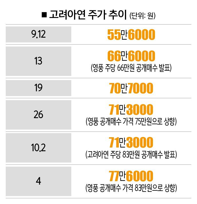 그러자 영풍은 9월 26일 고려아연의 공개매수 가격을 주당 75만원으로 올렸다. 고려아연 역시 가만히 있지 않았다. 지난 2일 고려아연은 주당 83만원에 자사주매입(10월 4일~23일)을 단행하겠다며 맞불을 놓으면서 매력적인 조건도 붙였다.
