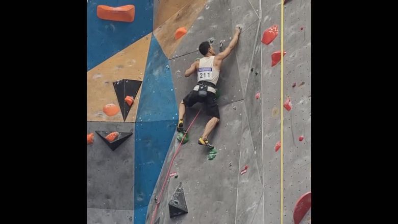 지난 9월 7일 전북 남원시 춘향골체육공원에서 열린 남원시장배 전국동호인 스포츠클라이밍대회 결선 중 기자가 7m나 추락하고 있다. 동영상을 캡처해 확대한 사진이다. 김홍준 기자 |