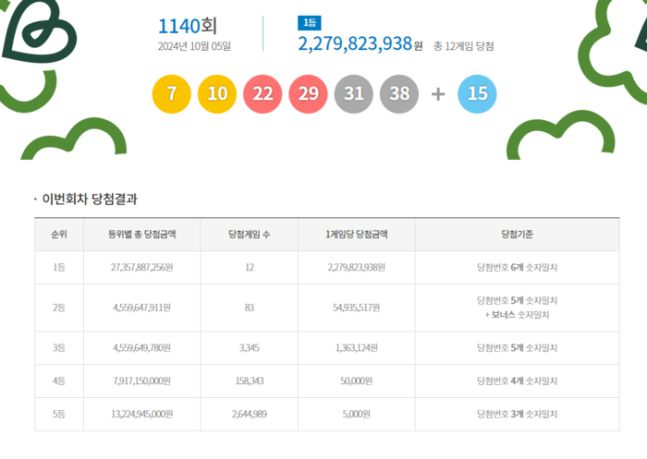 당첨번호 6개를 모두 맞힌 1등 당첨자는 12명으로 22억7982만원씩 받는다.