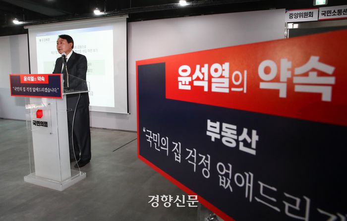 2021년 8월 29일 당시 국민의힘 대통령 후보가 서울 여의도 중앙당사에서 ‘국민께 드리는 윤석열의 약속’ 부동산편 공약발표를 하고 있다. 국회사진기자단 |
