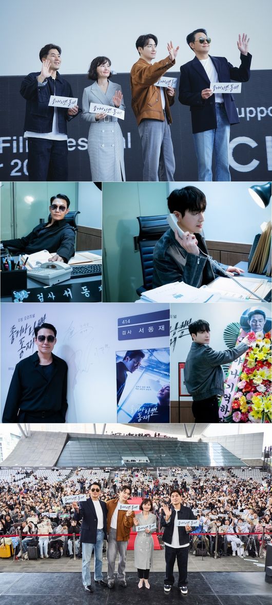 4일(금) 오후 7시 30분에는 2차 GV 상영을 통해 또 한 번 관객들을 만나 소통하는 소중한 시간을 가졌다. 5일(토) 오후 4시 영화의전당 야외극장에서 진행된 오픈토크에서도 수많은 관객들과의 만남을 이어나갔다. 촬영 현장부터 제작진과 배우들의 좋았던 분위기가 이번 부산국제영화제 오픈토크까지 이어지며 완벽한 팀워크를 보여줬다. 야외극장을 가득 채운 관람객들에게 이준혁은 “동재를 마음껏 조롱하고 비판하며 작품을 즐겨달라”, 박성웅은 “동재는 절대 미워할 수 없는 캐릭터이고 너무 귀엽다”며 ‘동재’ 캐릭터에 대한 남다른 애정을 표현했다. 여기에 이수연 크리에이터도 “이준혁 배우의 잘생긴 외모 덕분에 ‘동재’를 죽일 수가 없었다”는 위트있는 답변으로 현장 분위기를 한층 더 고조시켰다. 마지막으로 박건호 감독은 “동재의 시각으로 극을 따라가면 더욱 재미있게 작품을 보실 수 있을 것”이라고 전해 기대를 더했다. '좋거나 나쁜 동재' 팀은 GV부터 오픈토크, 티빙 팝업 방문까지 부산에서의 공식 일정을 성공적으로 마무리했다.