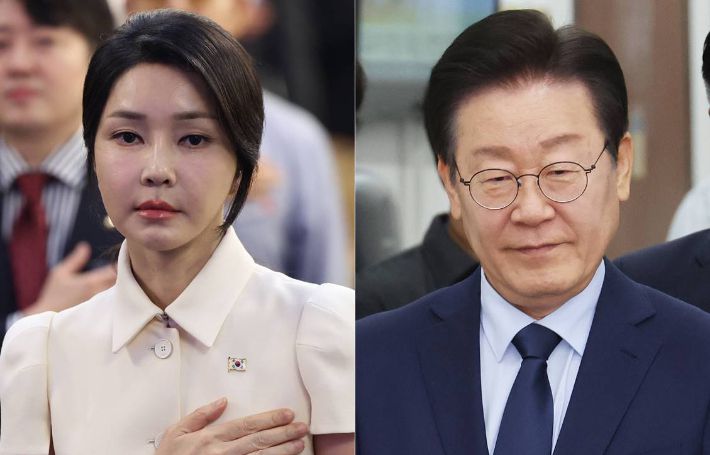 박상우 국토교통부 장관이 7일 오전 정부세종청사 국토교통부에서 열린 2024년도 국회 국토교통위원회 국정감사에서 여야 의원들의 질의에 답하고 있다(왼쪽)·김건희 여사. 연합뉴스 |