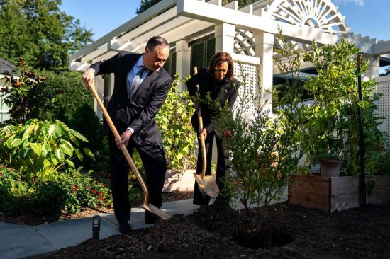 카멀라 해리스 미국 부통령(오른쪽)이 7일(현지시간) 관저에 나무를 심고 있다. [이미지출처=게티이미지연합뉴스] |