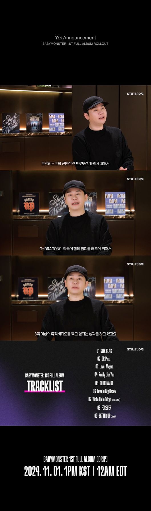 이날 공개된 영상에서 양현석 총괄 프로듀서는 베이비몬스터 정규 앨범 'DRIP'에 수록되는 9개의 트랙을 직접 설명해 눈길을 모았다. 전례에 없던 특별한 사전 프로모션 계획과 내년부터 진행될 글로벌 투어에 대한 희망과 포부를 전한 것이다.