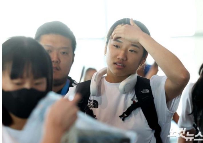 안세영이 지난 8월 6일(현지시간) 프랑스 파리 샤를 드골 공항을 통해 귀국길에 오르고 있다. 2024.8.6. 파리=올림픽사진공동취재단 |