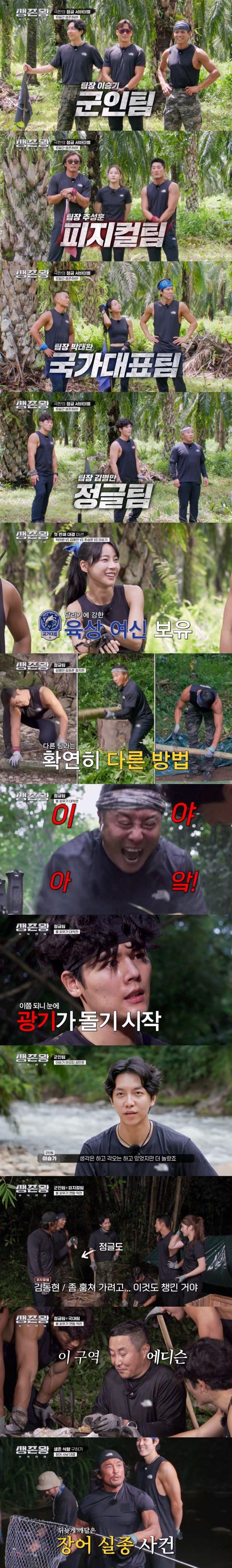 지난 7일 방송된 TV조선 예능물 '생존왕 : 부족전쟁'(이하 '생존왕')에서는 한국에서 비행기로 5시간 30분, 차로 5시간 걸리는 거리로 총 3700㎞ 떨어진 말레이시아 '사바 정글'에 멤버들이 도착했다. 1라운드 '열대우림', 2라운드 '무인도', 3라운드 '히든 장소'에서 10일간 각 팀이 대결했다. 정글·피지컬·군인·국가대표 중 단 한 팀만이 '생존왕' 타이틀을 가질 수 있다.