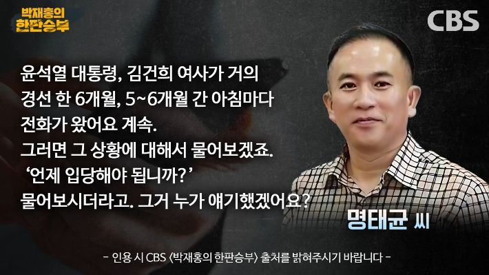 ◇ 박재홍> 저희 한판승부 제작진도 명태균 씨와 대통령 부부와의 관계를 지속적으로 취재해 왔는데요. 지금부터는 저희 제작진이 전화로 통화한 내용을 바탕으로 명태균 씨 입장을 전해 드리겠습니다. 먼저 대통령실에서 '윤 대통령이 명태균 씨를 두 번 만난 후 더 이상의 소통은 없었다'라고 밝혔지만 명태균 씨는 대통령 부부와의 소통은 경선 기간 5~6개월 동안 진행됐었고 주로 아침에 전화가 왔었다고 밝혔습니다. 명 씨의 입장을 목소리로 들어봅니다.