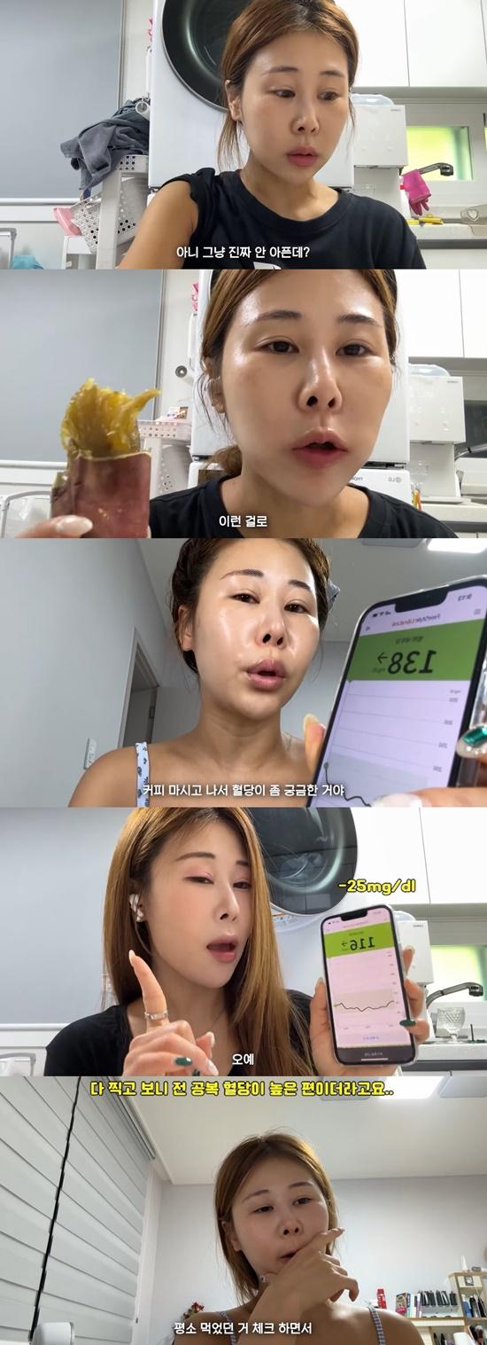이어 "공복에 커피 마시면서 준비하는 걸 좋아한다. 공복일 때 커피 마셨을 때 혈당이 궁금했다. 1시간이 지났는데 116으로 떨어졌다"며 다양한 음식 섭취 후 혈당을 체크했다.