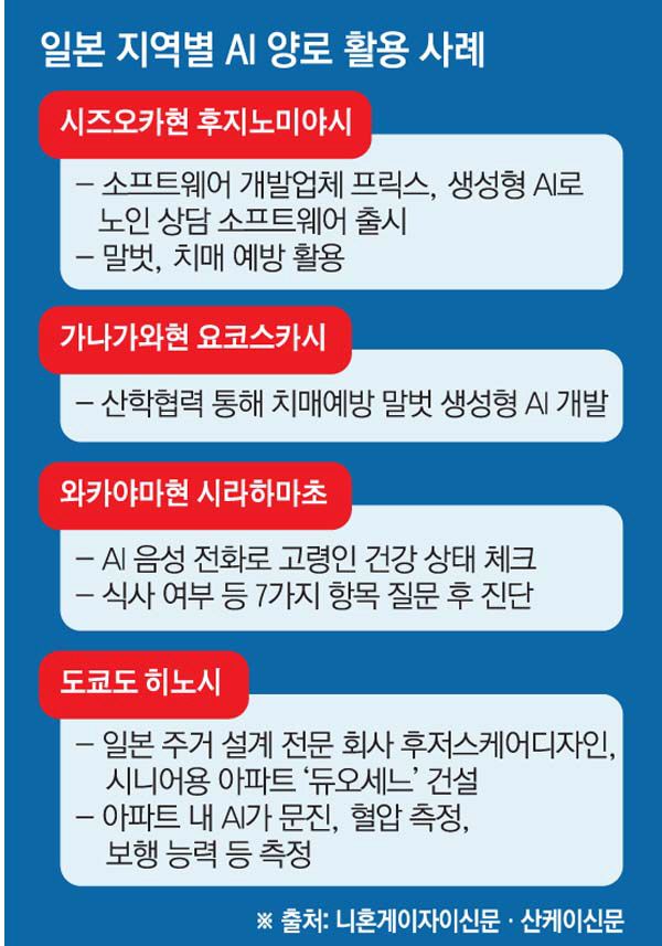 가나가와현 요코스카시도 산학협력을 통해 치매 예방을 목적으로 한 생성형 AI 앱을 개발 중이다. 이 앱은 AI에 쇼와 시대(1926년 12월 26일~1989년 1월 7일) 뉴스들을 학습시켜 노인들의 추억 회상을 돕도록 설계됐다. 요코스카시는 이달부터 시내 고령자 시설에서 이용자를 모집해 테스트에 나선다.