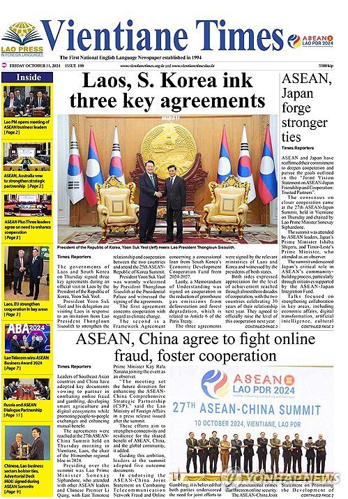 (비엔티안=연합뉴스) 진성철 기자 = 아세안 관련 정상회의 마지막 날인 11일(현지시간) 비엔티안 타임스, 파싸쏭, 빠텟 라오 등 회의 개최국 라오스의 주요 언론은 한·라오스 정상회담을 주요 뉴스로 다뤘다고 대통령실이 11일 알렸다. 사진은 비엔티안 타임스의 11일자(현지시간) 1면. 2024.10.11 [대통령실 제공. 재판매 및 DB 금지]