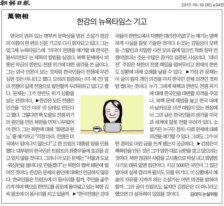 하지만 조선일보는 ‘김정은 위원장을 트럼프 대통령보다 더 비판했어야 한다’는 취지로 한강의 기고를 비판했다. 전쟁 위기의 원인을 제공한 건 핵 도발에 나선 북한 쪽이라는 논리에서다. 조선일보는 지난 2017년 10월10일치 신문에서 “그에게 북핵과 한반도 전쟁 위기에 대해 한국인을 대변할 자격을 주었나, 북핵 문제 해법을 놓고 한국 내에서 날카로운 의견 대립이 있는 현실에서 그의 글은 한국인들의 생각을 미국과 세계에 잘못 전할 우려가 있다”며 “그의 글이 트럼프도 싫지만 김정은은 더 아니라고 했으면 더 설득력이 있었을 것”이라고 지적했다. 신문은 ‘한국전쟁은 주변 강대국의 대리전 성격이었으며 이로 인해 수백만의 한국인이 사망했다’는 기고 속 대목도 문제 삼았다. 신문은 “명백하게 사실을 잘못 기술한 것”이라며 “‘대리전’ 주장은 북한의 전쟁 책임을 얼버무리고 현재의 한반도 상황에 대한 오해를 낳을 수 있다”고 했다.