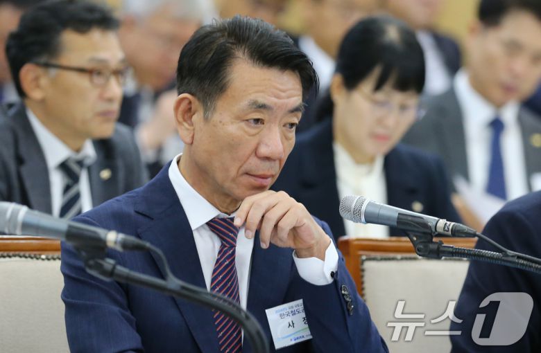 한문희 한국철도공사 사장이 11일 한국철도공사(코레일) 대전본사에서 열린 국회 국토교통위원회의 한국철도공사, 국가철도공단 등에 대한 국정감사에서 잠시 생각에 잠겨 있다. 2024.10.11/뉴스1 ⓒ News1 김기태 기자