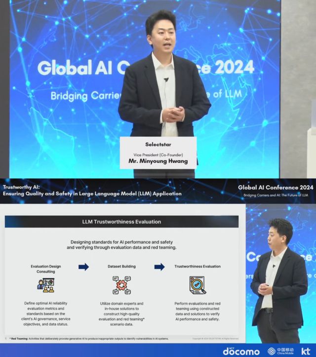 셀렉트스타는 AI 신뢰성 검증 기업으로써 글로벌 사업성을 인정받아 이번 행사에 초청됐다. 황 부대표는 ‘신뢰할 수 있는 AI(Trustworthy AI)’를 주제로 강연을 진행했다. 셀렉트스타가 AI 사업 분야에서 쌓아온 경험과 기술력을 바탕으로 거대언어모델(LLM) 품질 평가와 안정성을 확보하는 방법에 대해 설명했다.