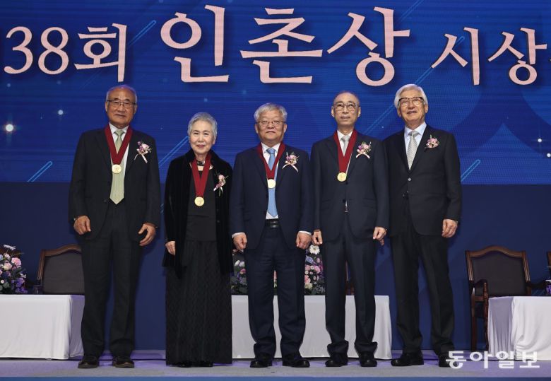 11일 서울 중구 웨스틴조선호텔에서 열린 제38회 인촌상 시상식에서 수상자들이 기념촬영을 하고 있다. 왼쪽부터 홍정길 밀알복지재단 이사장, 박정자 연극배우, 안대회 성균관대 한문학과 교수, 권인소 한국과학기술원 전기및전자공학부 KAIST 교수, 이진강 인촌기념회 이사장. 양회성 기자 yohan@donga.com |