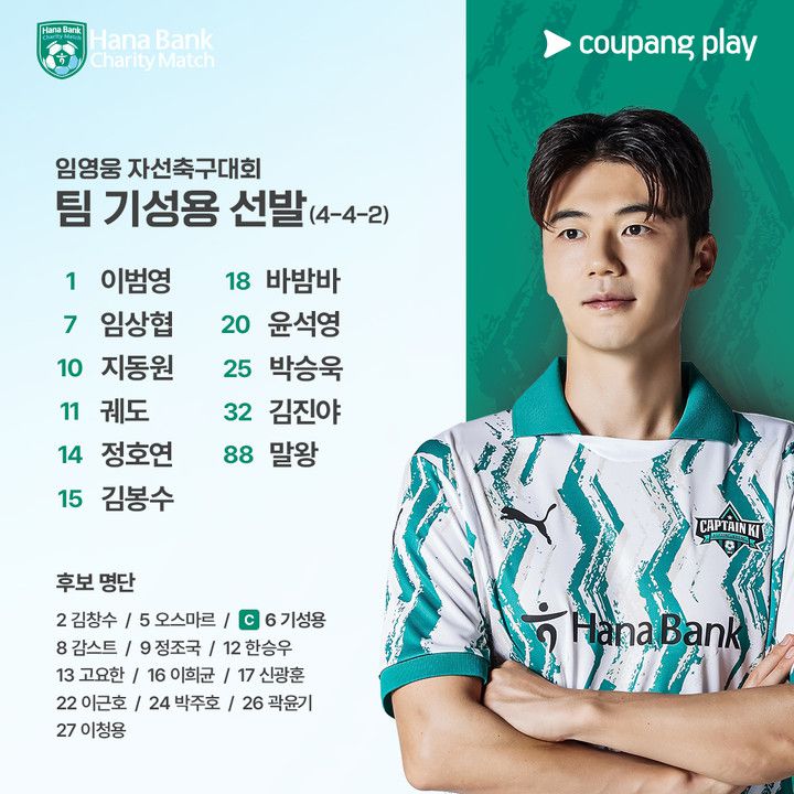 이에 맞서는 '팀 기성용'은 골키퍼 이범영과 함께 임상협, 지동원, 궤도, 정호연, 김봉수, 바밤바, 윤석영, 박승욱, 김진야, 말왕이 선발 명단에 이름을 올렸다.