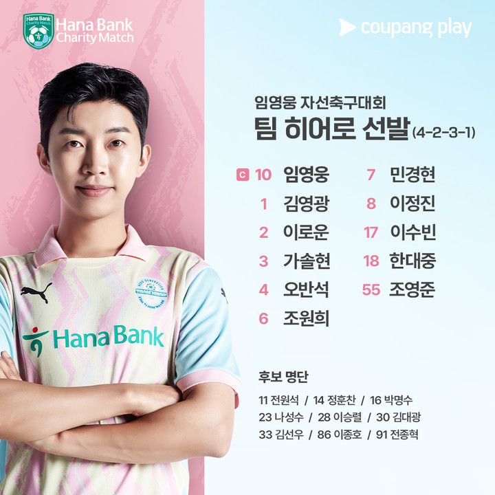 경기를 앞두고 선발 라인업이 공개됐다. '팀 히어로'는 주장 임영웅을 비롯해 골키퍼 김영광, 이로운, 가솔현, 오반석, 조원희, 민경현, 이정진, 이수빈, 한대중, 조영준 등이 선발 출격한다.