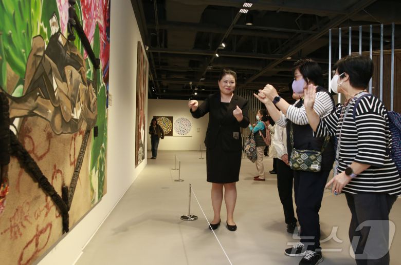 세화미술관에서 열리고 있는 제임스 로젠퀴스트의 개인전에서 도슨트가 수어로 설명하는 모습. 세화미술관 제공. |