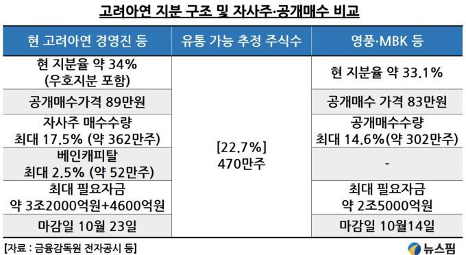 최윤범 회장(제리코파트너스)의 공개매수가격은 3만5000원으로 MBK의 3만원보다 5000원이 더 높다. 따라서 세금적인 측면을 감안하더라도 유통주식 43.4%의 보유자가 각각 절반씩 최회장과 MBK의 청약에 응할 것으로 가정하면 각각 21.7%씩의 주식을 추가로 취득하게 된다.
