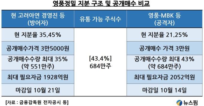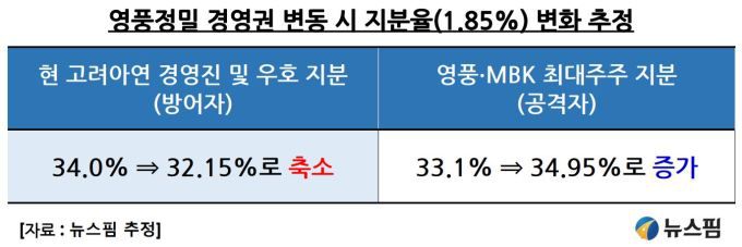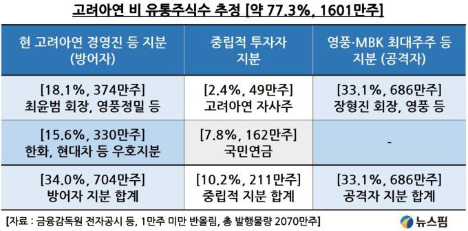 공격자인 영풍∙MBK는 최소 7%의 주식만 공개매수로 추가한다면 40.1%(기존 주식 33.1% + 공개매수 주식 7%)의 지분율로 유리한 고지를 차지할 수 있다는 분석이다.