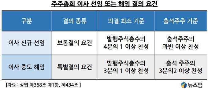 시간을 단축하려면 영풍∙MBK는 기존 이사를 중도 해임해야 한다. 그런데 이사 중도 해임은 주총 특별결의사항이다. 특별결의 요건(출석주주의 3분의2 이상)은 너무 엄격해 공격자가 이를 통과시킬 지분을 확보하기는 어렵다.