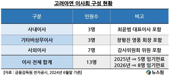 또 공격자 측인 장형진 영풍 회장이 이미 기존 이사진에 포함돼 있는 것도 방어자 입장에서는 악재다. 이런 경우 공격자인 영풍∙MBK가 주총 일반결의 요건만 획득하게 되면 꼭 정기주총까지 기다릴 필요도 없다. 임시주총을 통해 6명의 이사를 신규 선임하면 장형진 이사까지 총 7명의 이사진으로 경영권을 장악할 수 있다.