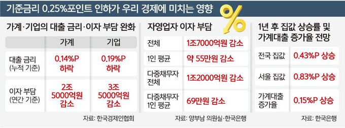 이번 금리 인하로 국내 가계·기업의 대출 금리와 이자 부담은 장기적으로 다소 덜 수 있을 것으로 보인다. 한국경제인협회에 따르면 가계의 이자 부담액은 연 2조5000억원, 기업의 이자 부담액은 연 3조5000억원 감소할 것으로 추산된다.