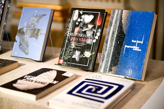 한강에 대한 세계 독자들의 관심이 뜨겁다. 영국·프랑스에서는 품절 사태가 벌어졌다. 스톡홀름 스웨덴 아카데미에 전시된 한국 작가 한강의 책들. [AP=연합뉴스] |