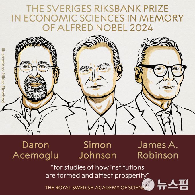 [사진=스웨덴 왕립과학원 노벨위원회 뉴스핌] 장일현 특파원 = 2024년도 노벨 경제학상을 수상한 대런 에이스모글루 MIT 교수, 사이먼 존슨 MIT 교수, 제임스 로빈슨 시카고대 교수(왼쪽부터) 2024.10.14. ihjang67@newspim.com |