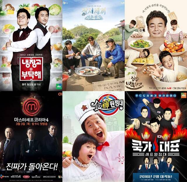 음식을 소재로 한 예능 프로그램은 방송가에 꾸준히 등장했다. 사진은 '냉장고를 부탁해' '삼시세끼 어촌편5' '집밥 백선생' '쿡가대표' '식신원정대' '마스터 셰프 코리아4'(왼쪽 위부터 시계방향) 포스터다. /JTBC, tvN, Olive, MBC every1