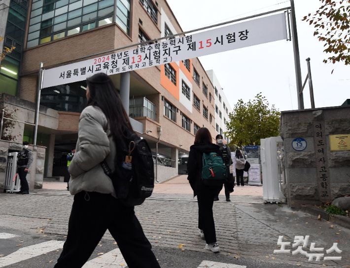 2024학년도 대학수학능력시험일인 16일 오전 서울 영등포구 여의도여고에 마련된 시험장으로 수험생들이 들어서고 있다. 황진환 기자 |